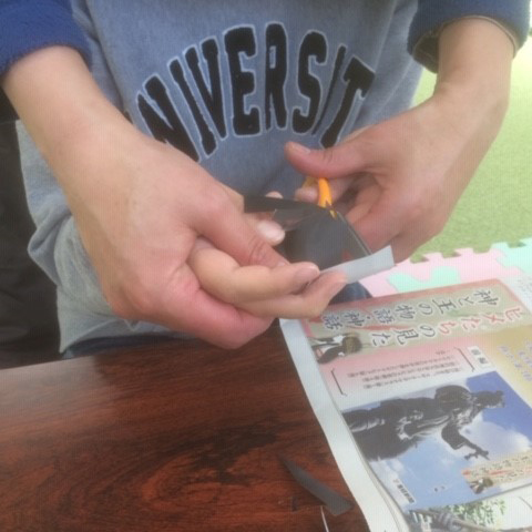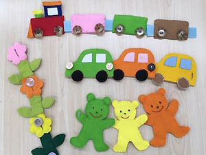 マジックテープやスナップボタン、ボタンを付けたり外したりする練習をします。