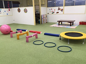 トランポリン、平均台、ハードル、バランスボードなどを使って体全体を使って運動します。
